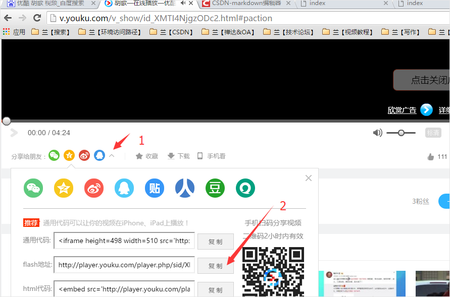 3、百度随便搜索一个优酷视频,在分享给朋友那里,点击小箭号,在flash地址中,点击复制,复制flash地址。