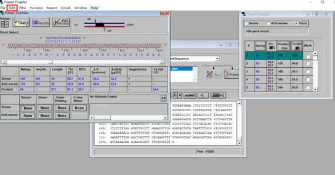 1、点击其中一对引物,如第1#引物,并把上述窗口挪开或退出,显示“Peimer Premier”主窗口,所得结果分三部分,