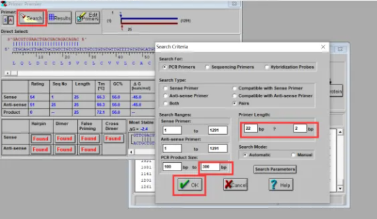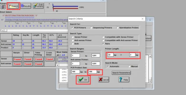1、打开DNA序列后点击按钮primer,出现“search criteria”窗口,有多种参数可以调整
