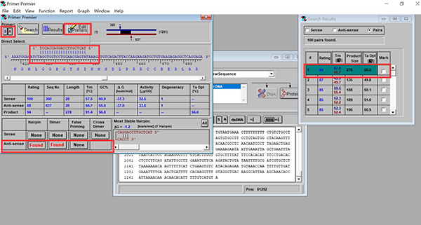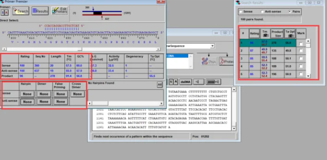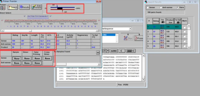 以系统给出的第一对引物为例(看框住的地方),虽然系统给出的评分比较高,但是下游引物可能出现发夹结构(Hairpin)和二聚体(Dimer),我们可以尝试调整一下。