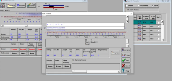 4、一对理想的引物应当不存在任何一种上述结构,因此最好的情况是最下面的分析栏没有,只有。值得注意的是中间一栏的末尾给出该引物的最佳退火温度