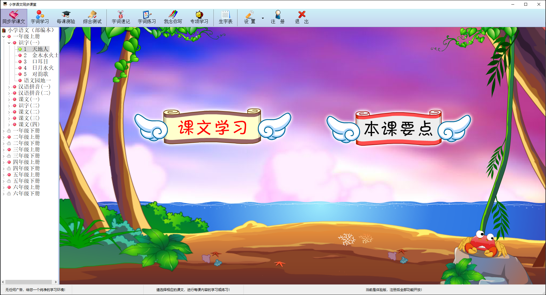 1、软件中囊括了语文1-6年级的内容,发音全部为真人标准普通话,课文有真人情境朗读+重点学习介绍,字词都有强化练习与学习,包括全部生字的动画笔顺及组词例句等。