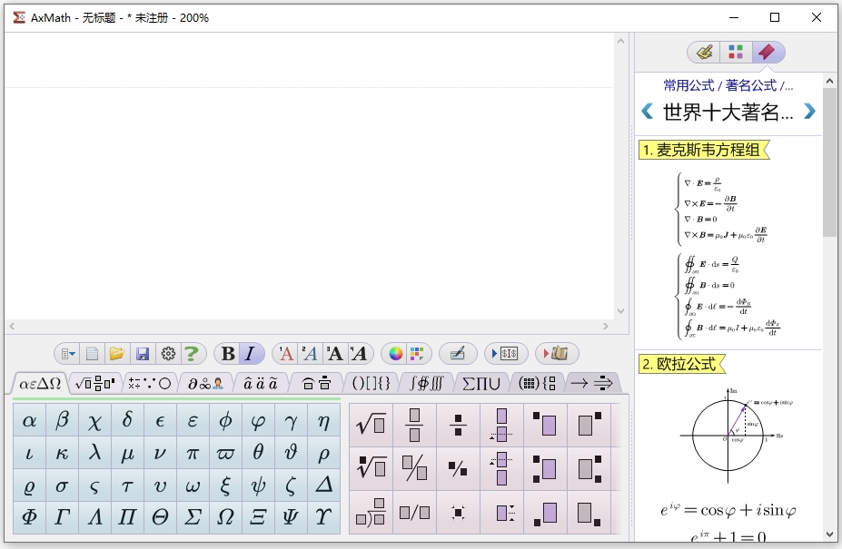 axmath官方版是一款强大的数学公式编辑器,提供了丰富的数学编辑功能、实时预览、可定制的排版风格等特点,使用户能够轻松创建和编辑各种复杂的数学公式和方程,为数学工作提供了便利和效率。