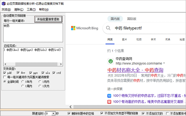 1、亿愿必应搜索文档下载可以批量搜索关键词,可以搜索指定天数内的数据,可以自动分析未分析项,自动下载文件,软件只需输入批量关键词,设置好了以后,全自动分析提取下载文档。