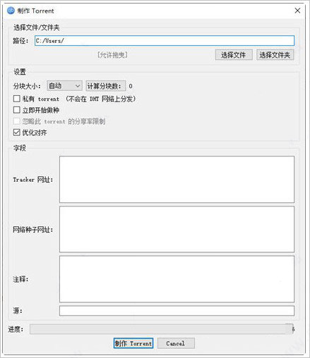 2、点击选择自己要发布的文件或文件夹,并且勾选“立即开始做种”选项,最后填写“Tracker网址”、“网络种子网址”以及注释等内容,最后点击底部的“制作 Torrent”按钮即可;