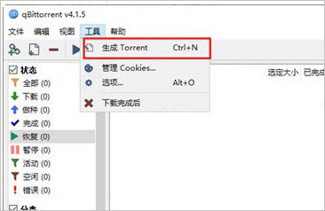 1、进入软件后,点击顶端工具栏中的“工具”,接着选择“生成 Torrent”选项,或者可以直接使用快捷键Ctrl+N;