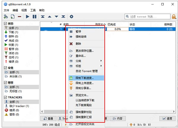 4、另外右击下载的资源,可以限制下载上传速度,预览文件等。