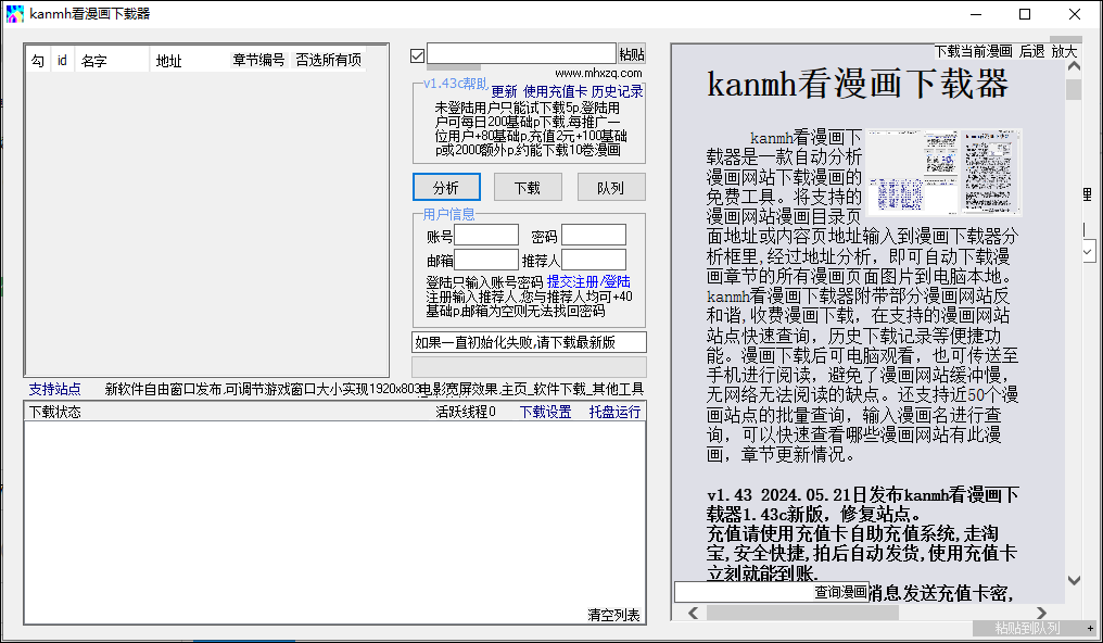 kanmh下载器主要提供漫画地址输入框、分析、下载、章节分析结果、支持站点、内置浏览器、漫画查询及下载记录等功能模块,能够实现用户对漫画下载流程的完善控制,节省时间和精力,提高用户满意度,有需求的朋友请下载体验。