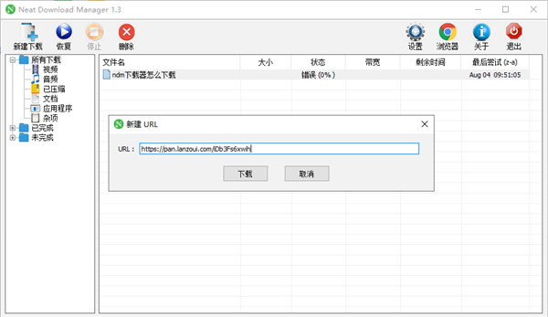 在Windows下载器中,相信idm可谓是无人不知,有着强大的嗅探功能,还不限制速度,但需要付费,价格虽不高,但很少人愿意花钱,因此小编今天为大家带来了一款简单、轻巧且完全免费的专业的电脑下载工具,就是这个neat download manager中文版,简称为ndm下载器,该软件与idm各方面功能都很相似,拥有不足1MB的超迷你身材和极其简洁明了的用户界面,支持HTTP、HTTPS、FTP、HTTP代理、SOCKS协议以及HTTP身份验证和代理身份验证,还支持拖放功能,采用优化过的动态细分算法,可将资源下载速度加速到最为理想的带宽上限速度,并根据下载状态和资源后缀来为用户区分下载的的文件类型,比如视频、文档、压缩文件等,而且可以下载HLS视频的所有.ts文件,最后将所有片段合并为一个完整的.ts文件。neat download manager软件还支持浏览器插件,可以向所兼容的浏览器发送下载链接,帮助用户从任何支持的网站下载音视频文件。为了保证不影响正常的网页浏览体验,软件还可以对带宽以及最大连接数进行限制,同时具备暂停和恢复功能,即便是已经崩溃的下载链接依旧可以恢复下载。