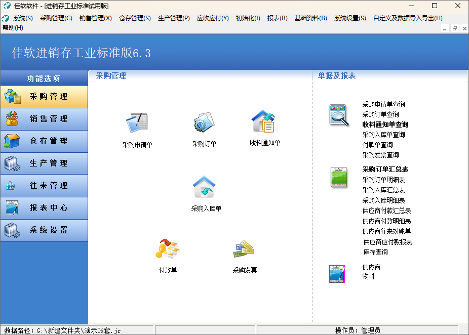 佳软进销存工业单机版是由湖州佳软信息技术有限公司开发的一款非常实用的软件,它融合了企业核心业务所需要的各种功能,其主要的模块有:采购管理、销售管理、仓库管理、往来管理、报表中心、系统设置,专注于企业的采购、销售、仓存、成本核算、应收应付等核心业务的管理系统。通过该软件用户能够轻松掌握企业各项业务和往来款项管理,严格控制企业的物流、资金流、信息流,帮助企业建立一个信息集成的工作环境,实现业务运作的信息共享与全程控制,及时了解企业的各项业务细节。