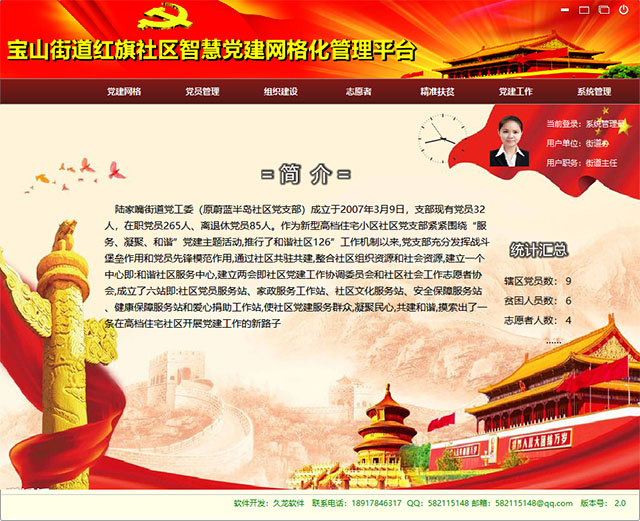 智慧党建网格化管系统是专为社区党建工作者们制作提供的一款绿色小巧的电脑行政办公软件,该软件中为用户提供了社区地图发布、辖区平面图、辖区简介、党建风采、民情日记、组织活动等信息,同时支持用户在这里进行党员管理、组织建设、志愿者安排、党建工作、精准扶贫等功能,非常的全面,可以更好的轻松的管理所在社区的党建信息。而且通过现代信息技术不仅可以更好的融入基层党务工作之中,还能更好的备份信息查找信息,使用起来更加的方便,能有效的提高工作质量和效率。
