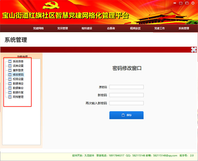 智慧党建网格化管理系统是一款专为社区党建工作者设计的绿色小巧软件,功能非常强大,涵盖了地图发布、辖区简介、党员管理、组织活动等多种实用功能。用户可以轻松完成党建工作中的各种任务,比如精准扶贫、志愿者安排和党费收缴等。这款软件不仅操作简单,无需安装即可使用,默认密码是123,进入界面后还能自定义街道信息或背景图片,系统管理中还可以更改密码。