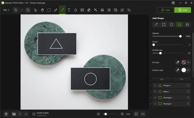 - 用一些基本的形状就能创造出一些令人吃惊的东西,这就是为什么我们的图片编辑器提供所有常见的形状,对于任何初学者来说,这些都是必不可少的工具。形状是所有艺术品的基石,所以了解如何使用它们是创造美丽视觉的基础。