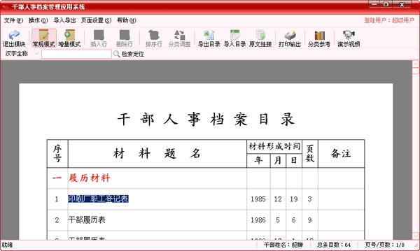 由于干部人事档案的组成,具有动态性的这个特点。不同历史时期,有不同的材料被收集、整理和存档,因此要求软件系统能够灵活的更新归档材料目录。系统采用直接读、写目录的方式,用户可以很容易的添加、删除、排序新插入的材料数据。(支持最新的A4版标准)