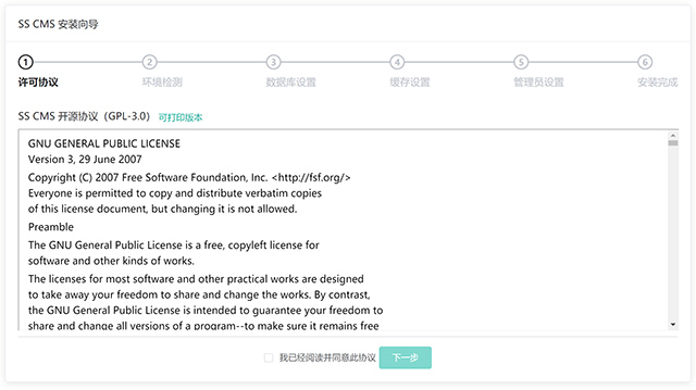 如果系统尚未安装,点击进入管理后台按钮后系统将跳转页面至 SSCMS 系统安装向导页面。