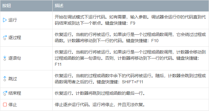 “代码”窗格显示过程或函数的代码。你可以在语句旁的灰色范围点击 断点 来为调试添加或移除断点。