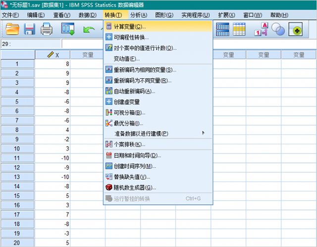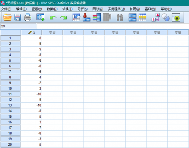 1、求绝对值可以借助SPSS内置的abs函数。图1为待分析数据,为随机生成的整数,下面为大家详细介绍。