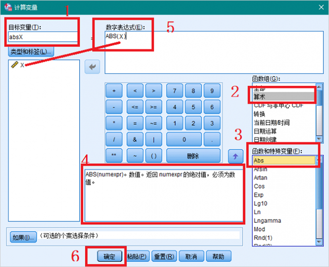 3、在下图界面中,首先在标记为1的位置指定目标变量的名称,这里将这一新变量命名为absX,意为求解X绝对值。然后在标记为2的位置,找到“算数”函数组,并单击,算数函数组中的全部函数会在标记为3的“函数和特殊变量”项目中显示,找到“Abs”函数并双击,此时Abs函数填充至标记为5的“数字表达式”项目下。观察标记为4处的函数说明,了解到函数格式为ABS(numexpr),numexpr代表变量,将待分析变量X代替numexpr,点击【确定】,SPSS将计算变量X全部数据的绝对值,并输出至变量视图。