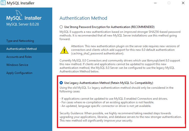 如果选第一种方式,很可能你的navicat等客户端连不上mysql8。所以这里一定要选第二个(下图红框的地方)