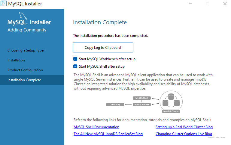 完成点击Finish(第一个是Mysql的客户端,如果不使用只勾选第2个“start mysql shell after setup”,点击“finish”)(到这里数据库的安装就完成了)