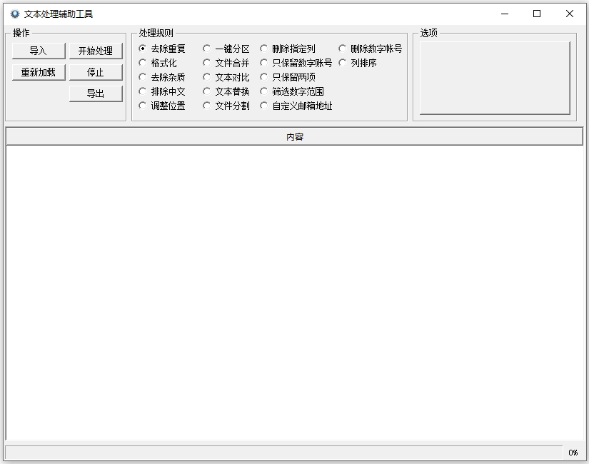 文本处理辅助工具是一款专业的文件处理工具,这款软件可以让用户在编辑和处理文本的时候更加轻松,其此软件是针对TXT文本开发的软件,因此你仅仅可以添加TXT到软件处理,非常实用,同时支持去重、格式化、一键分区、文本对比、文本替换、文本分割等等功能,处理文本的速度也非常的快。除此之外,文本处理辅助工具操作非常简单,只需导入需要处理的文本文件,选择处理规则,一键即可开始处理,快速且高效的输出处理后的文件,可将文本文件按照指定规则进行处理,文件处理完成后,可将其进行导出,设置输出位置,将文件保存至指定位置,便于快速查看,有需求的用户可在此点击下载!