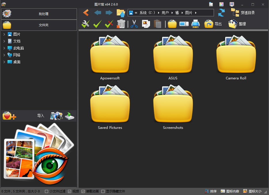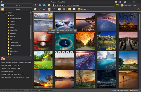 图片馆电脑版是一款功能强大,且简单实用的图片管理和编辑软件,英文名:Picosmos Shows,它不仅可以帮助用户更好的管理本地电脑上的图片,同时可以对图片进行常用的编辑操作,包括图片排版,图片分割、图片合并、图片美容特效,图片拼接,图片调整大小等等。另外软件还支持图片批处理功能,包括批量调色,批量优化,批量转换,批量增加水印等操作。