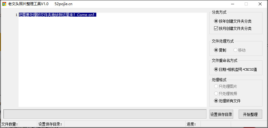 相信在摄影师和喜欢收藏图片的小伙伴们的电脑中有着海量照片,但是如果你需要手动人工整理照片的话就相当的费时,不过使用老文头照片整理工具的话只需直接将照片、视频或者文件夹直接拖到软件中,接着只需选择下分类方式、文件处理方式、文件重命名方式、处理格式等参数,然后设置下保存目录再点击开始整理即可开始一键执行整理了,最后整理好的文件就将会自动归档到不同的文件夹中,十分强大,欢迎有需要的用户们免费下载体验尝试。