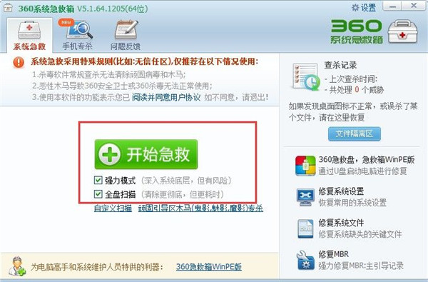 360系统急救箱32位是由360官方推出的一款木马查杀软件,此版本是专门为32位系统而开发的,同时也附带了360急救箱64位,具有文件恢复、系统重装、应急上网等功能,可以在Windows无法启动时对计算机进行引导和修复,为用户解决电脑上的各种疑难杂症,同时还支持查杀电脑恶性病毒,其中包含驱动型及MBR型(犇牛、机器狗、灰鸽子、扫荡波、磁碟机等),甚至还支持扫描清除安卓手机顽固木马,可以说是我们用户在装机是的必备软件了。