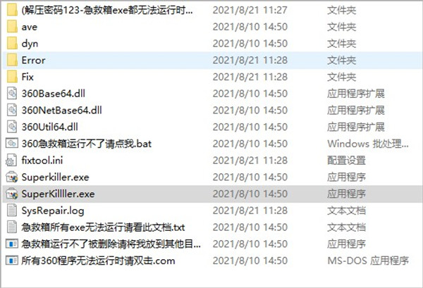 将里面的SUPERKILLER.EXE拷贝到C:Program Files360360Safefirstaid(确保你的急救箱程序所在路径为C:Program Files360360SafefirstaidSuperKiller.exe否则请自己修改)覆盖掉破坏的EXE文件,再启动该程序即可.记得覆盖前先关掉360安全卫士的自我保护,否则会拷贝失败。