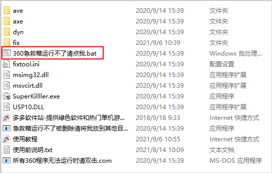 1、解压完毕后在文件夹中有一个叫做“360急救箱运行不了请点我”的文件,双击鼠标左键点击它;