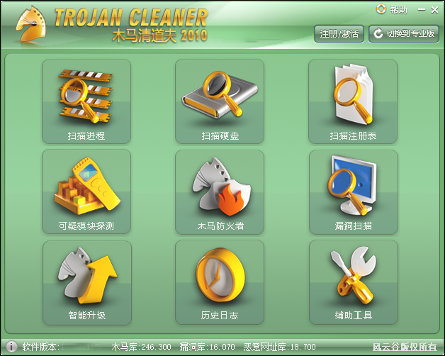 1、自动查杀数十万木马病毒、流行病毒和间谍软件等。并拥有海量木马病毒数据库。