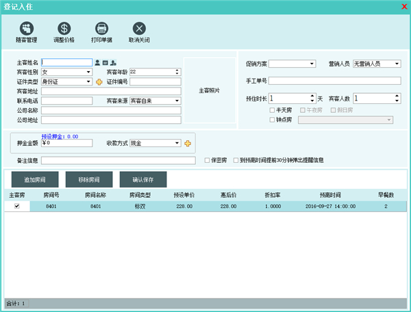 a、散客入住:直接在登记宾客信息后,点击确认保存即可