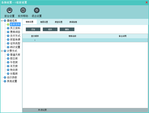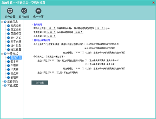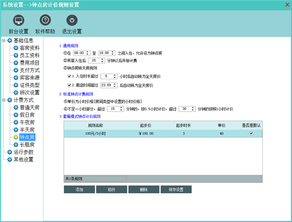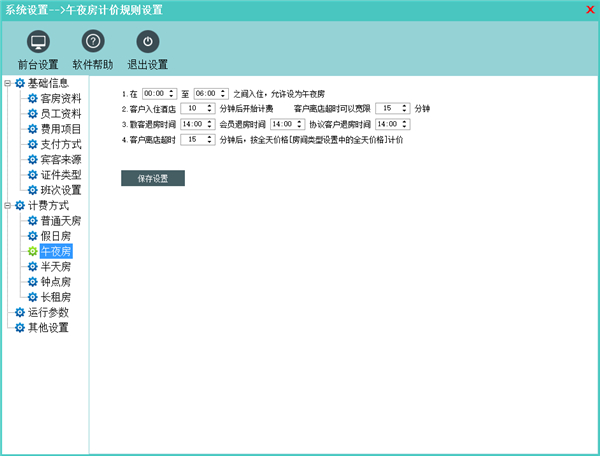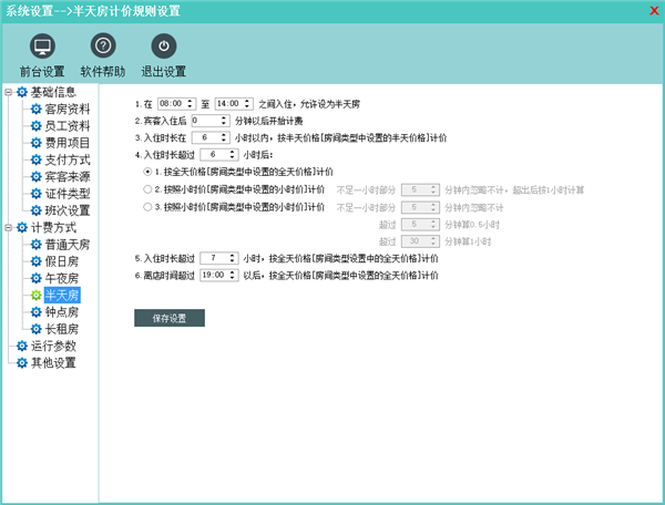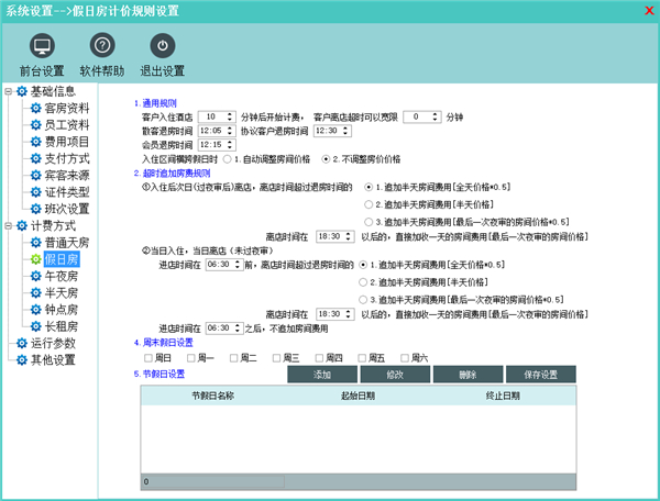 1.软件中的计费,一共分为5种方式(普通天房、假日房、午夜房、半天房、钟点房)。详细的设置界面如下: