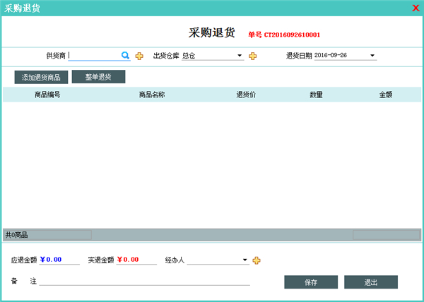 操作上面同采购进货。“整单退货”是通过查找已有的采购进货单,对采购单内的商品进行整单退货操作。