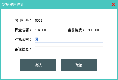 3、费用红冲:对当前消费做冲抵操作。该操作主要用来调整在住宾客的客房消费总额,冲抵金额为“正”,则增加,反之减少。