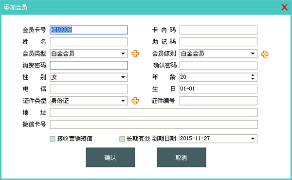 添加会员界面(在该界面可以快速添加会员类型、会员级别、证件类型等信息)