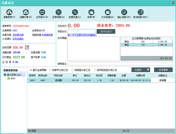 9、签单结账:该操作是指在宾客离店时,由协议客户签单[赊账]。该操作默认会根据折扣金额计算签单总额,实际签单金额可以有操作员修改[当签单金为0的时候,表示在享受折扣的情况下,直接付款结账]。