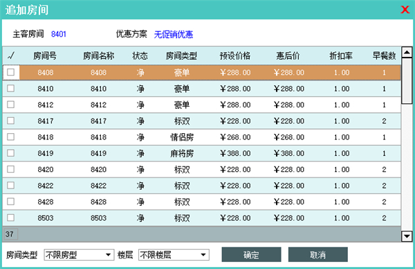 b、团队入住:在登记入住界面,点击下方追加房间按钮,弹出“追加房间”窗口
