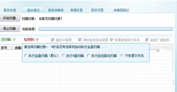 6、单击【开始扫描】按钮,弹出【请选择扫描对象】信息提示框,这里采用系统默认设置,即【执行全盘扫描】选项