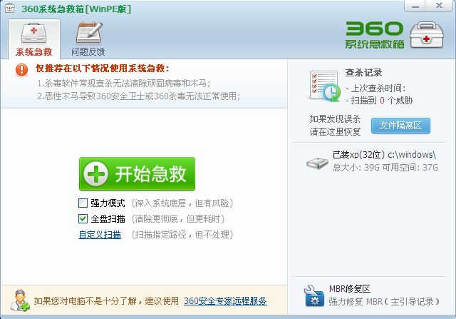 360系统急救箱winpe版是针对winpe系统而开发的一款系统急救软件,一般又称为360急救箱pe版,包括了32位和64位两个版本,支持查杀电脑恶性病毒,包含驱动型及MBR型,同时支持扫描清除安卓手机顽固木马。同时软件还具有文件恢复、系统重装、应急上网等功能,可以在Windows无法启动时对计算机进行引导和修复,有效的保障我们系统的安全,欢迎免费下载体验。