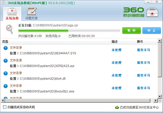 5、从U盘上运行360系统急救箱WinPE版,开始杀毒。