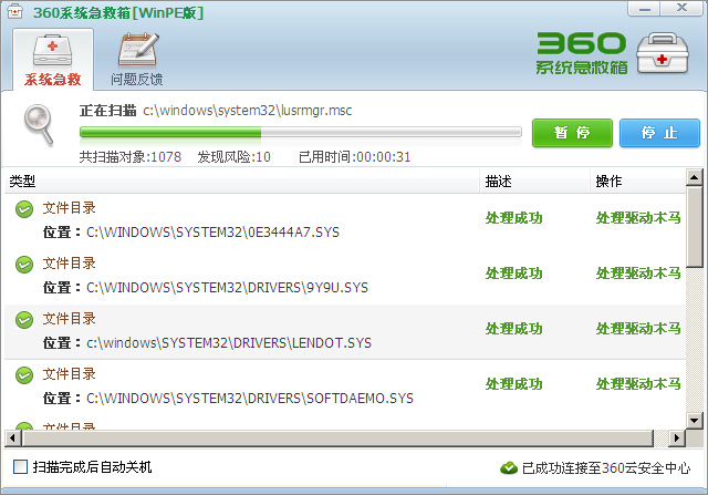 9、重启电脑到正常系统,再用360安全软件扫描,清扫战场,效果更佳。