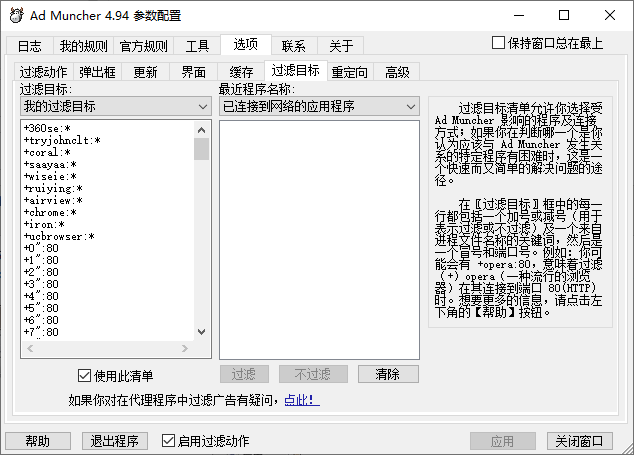 本次小编分享的Ad Muncher v4.94绿色中文版是最新版本,预先已设定好过滤规则,无需再设置,解压即可使用。具体步骤如下: