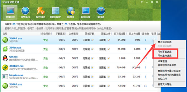 1、管理网速:可以限定某些软件访问网络或者禁止连接网络,点击下载限制和上传限制。或者点击管理右键禁止上网,限制网速。如图所示。