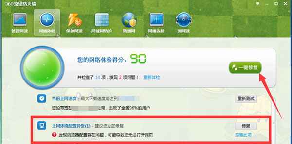 2、网络体验:点击网络体验后,开始检查存在问题,如图所示,检测到有两项问题需要修复,直接点击修复。