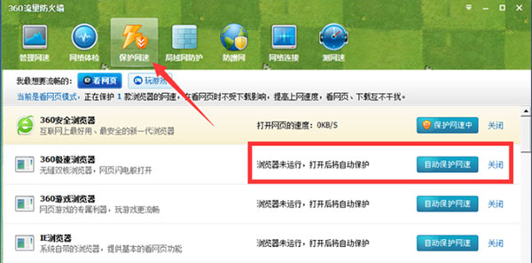 3、保护网速:针对于浏览器设置,用于看网页或者玩游戏时,保护浏览器网速。