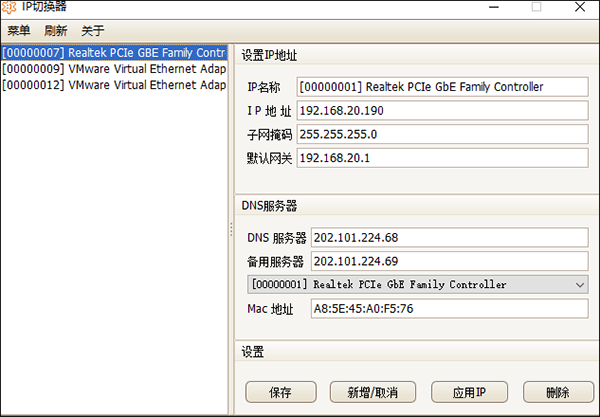 为方便了以后的备份和修改,用户可以将想要设置的 IP 等信息保存为方案。主界面里只提供预览功能,要想添加或修改方案,在主界面里选择目标方案,右侧就会显示该方案内容。如果你是第一次使用本软件,点击“菜单”—“获取本机IP地址”可自动检查本机网卡地址,如下图所示: