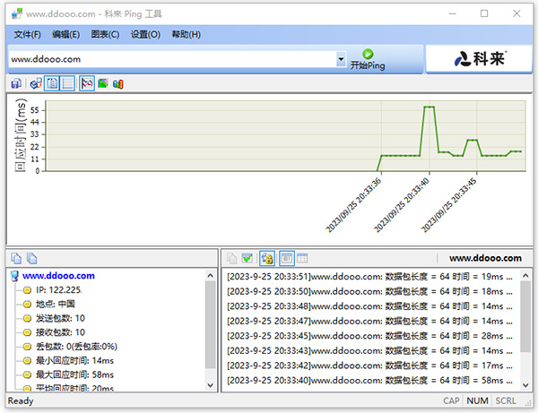 Ping多个主机时(一个域名,一个IP),科来Ping工具的界面如下图。