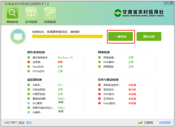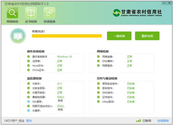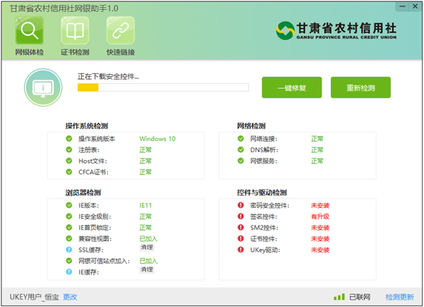4、环境修复将环境检测中发现的问题进行修复,主要包括安装数字证书链、修复安装网银KEY驱动并运行其用户工具、修复安装数字签名件与密码保护控件、浏览器的安全级别、ActiveX设置等。