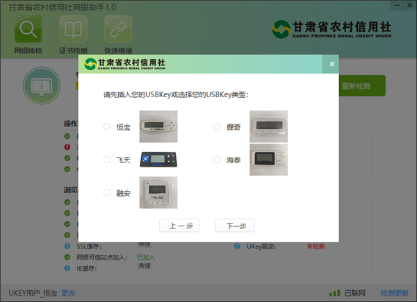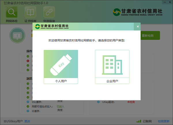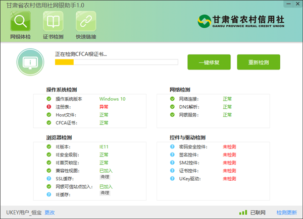 2、环境检测将检测当前与网上银行环境相关的计算机设置、硬件连接、数字证书等;主要包括:操作系统版本、浏览器版本信息、网络配置、网上银行必须的安全控件、数字证书证书链与网银KEY驱动等方面的检测。